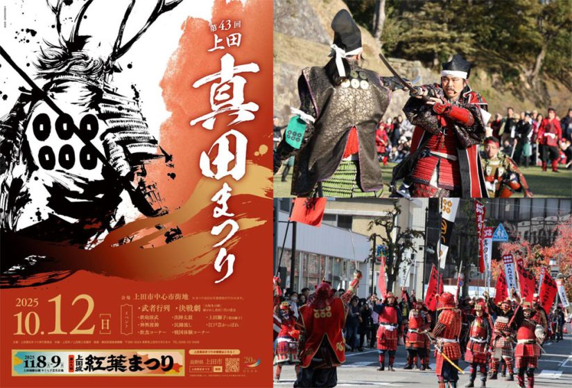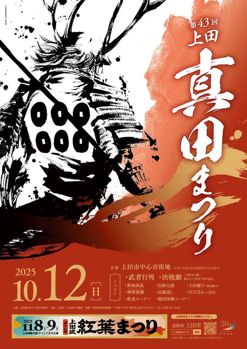 2025年10月12日(日)に、長野県上田市中心市街地で『第43回上田真田まつり』が開催。真田武者が練り歩く壮大な武者行列をはじめ、鉄砲隊による迫力満点の演武や、市内太鼓団体による勇ましい演奏、有志による決戦劇などが行われます。上田の街全体が戦国一色に染まり、まるで戦国時代にタイムスリップしたかのような光景が目の前に広がります。