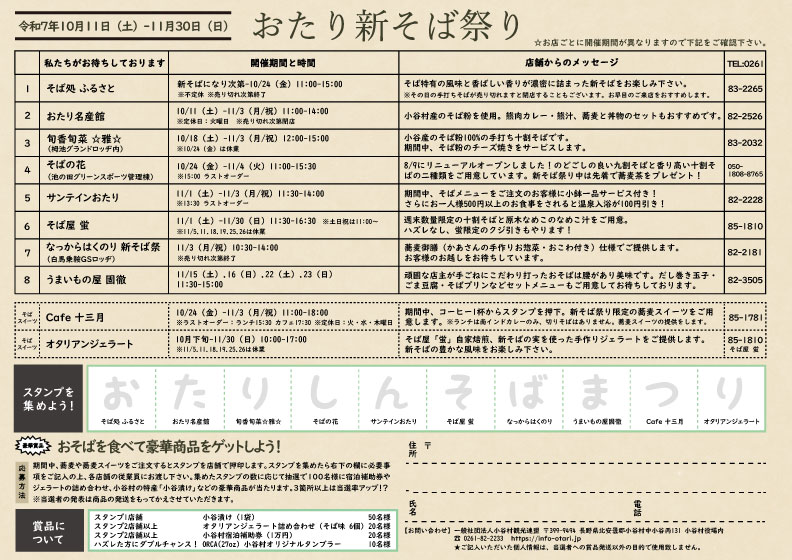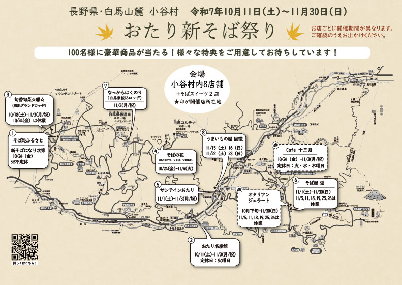 小谷村で今年も『おたり新そば祭り』が開催。期間は、2025年10月11日(土)から11月30日(日)までとなっています。村内の8つの蕎麦店と2つのそばスイーツ店が参加し、お店ごとに異なる期間で新そばの風味を楽しむことができます。