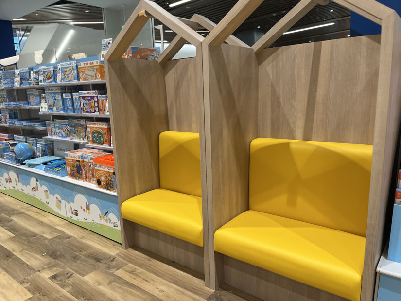さらに特徴的なのが、木製の家型フレームで区切られた小さな読書スペース。黄色いクッションの座席が設けられ、子どもたちが自分だけの空間で読書を楽しめるようになっています。