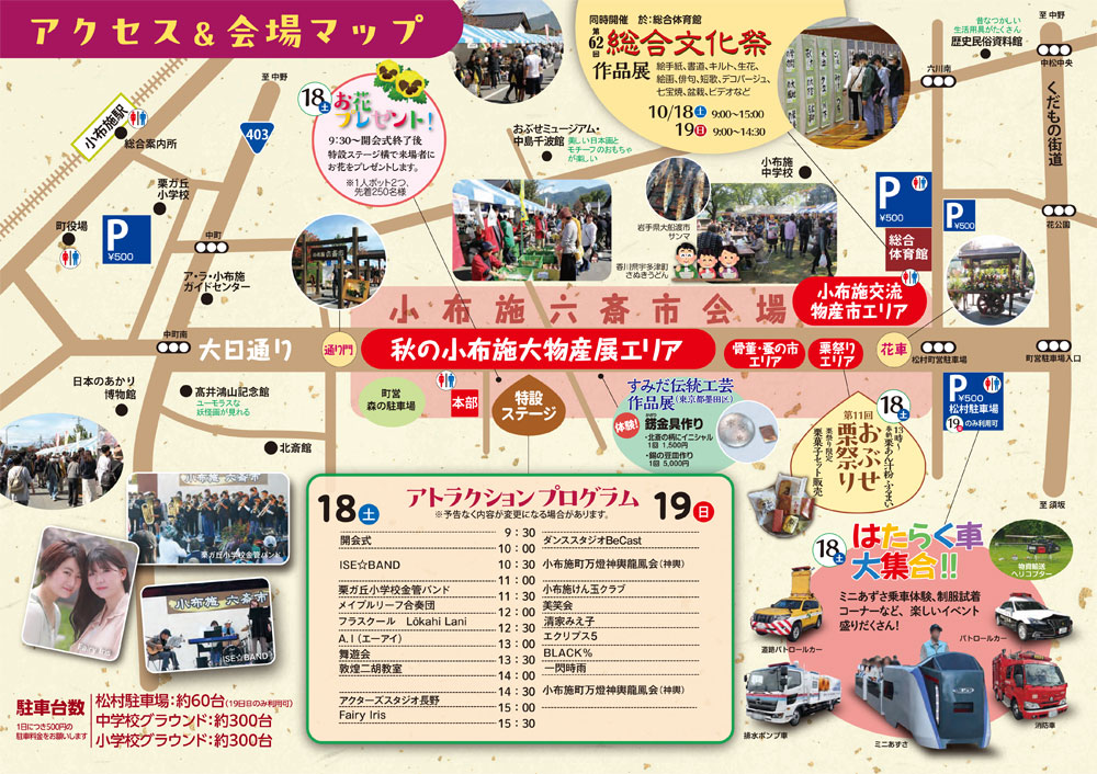 10月18日(土)は、毎年恒例の栗あん汁粉のふるまいや、栗まつり限定栗菓子セットの販売がある『第11回おぶせ栗祭り』が同時開催。また、お花プレゼント、ミニあずさ乗車体験や制服試着体験ができる『はたらくくるま大集合!!』など行われます。