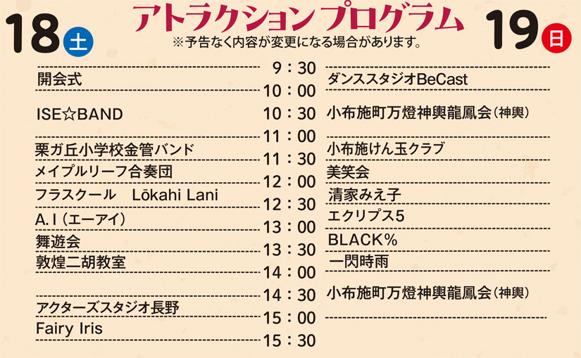 両日とも10時と14時30分から、小布施町万燈神輿龍鳳会による神輿が大日通りを練り歩きます。