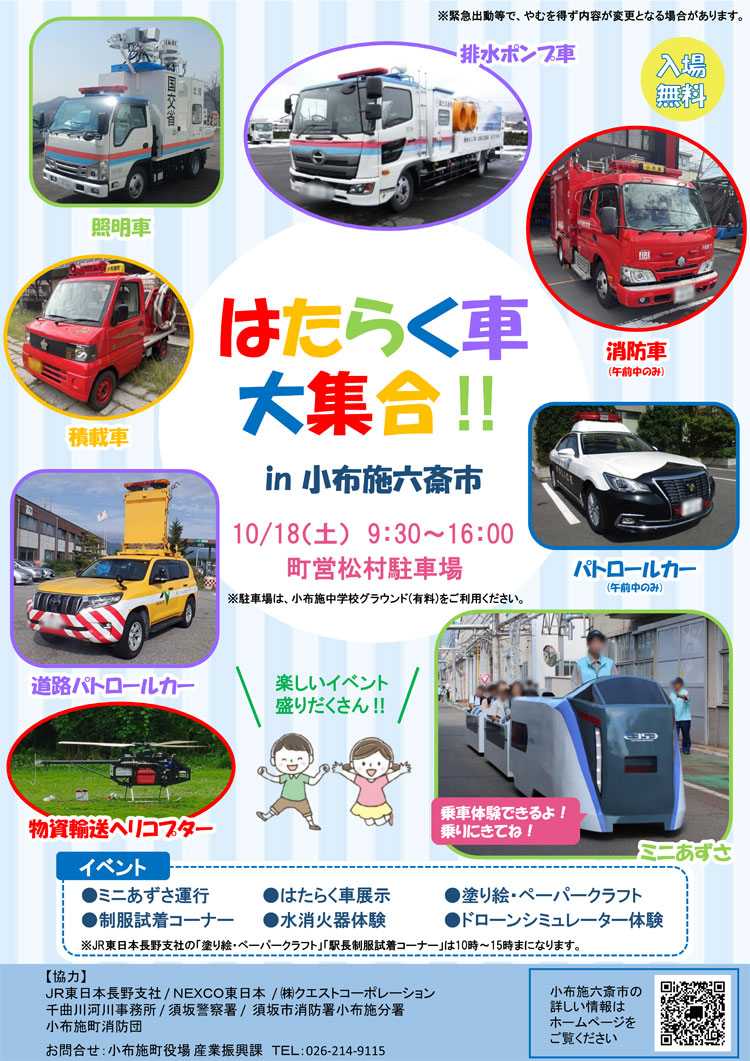 子どもに人気の「ミニあずさ」乗車体験(無料)や駅長制服の試着コーナーのほか、物資輸送ヘリコプター、パトロールカー、消防車なども展示されます。