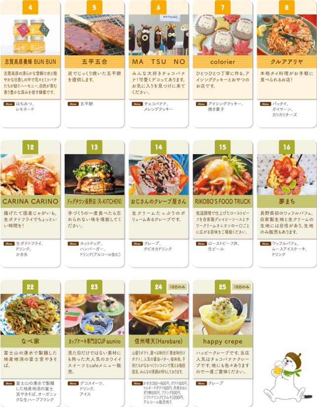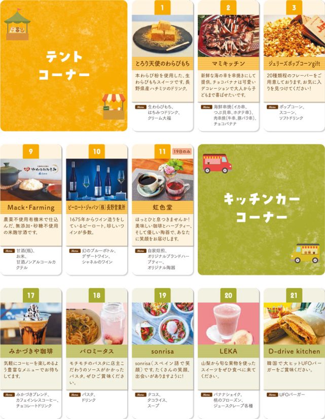 かき氷、ポテト、トルネードポテト、肉巻きおにぎり棒、フランク、ソフトドリンク(ラムネ)、アルコール販売あり