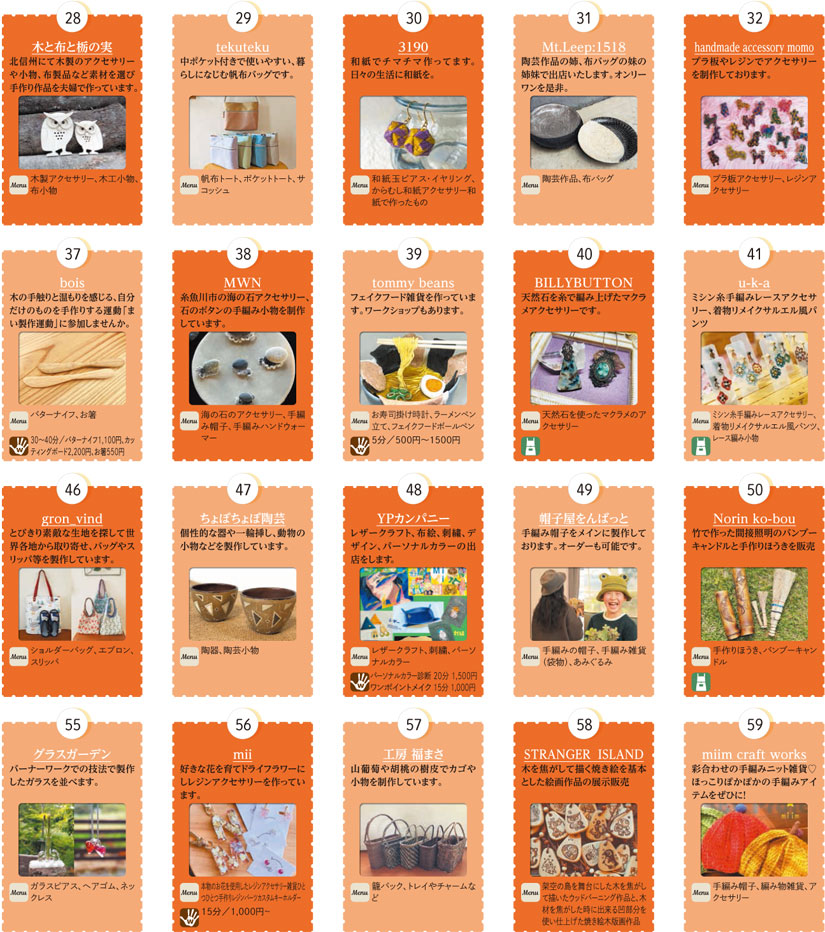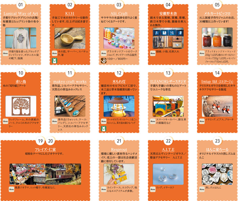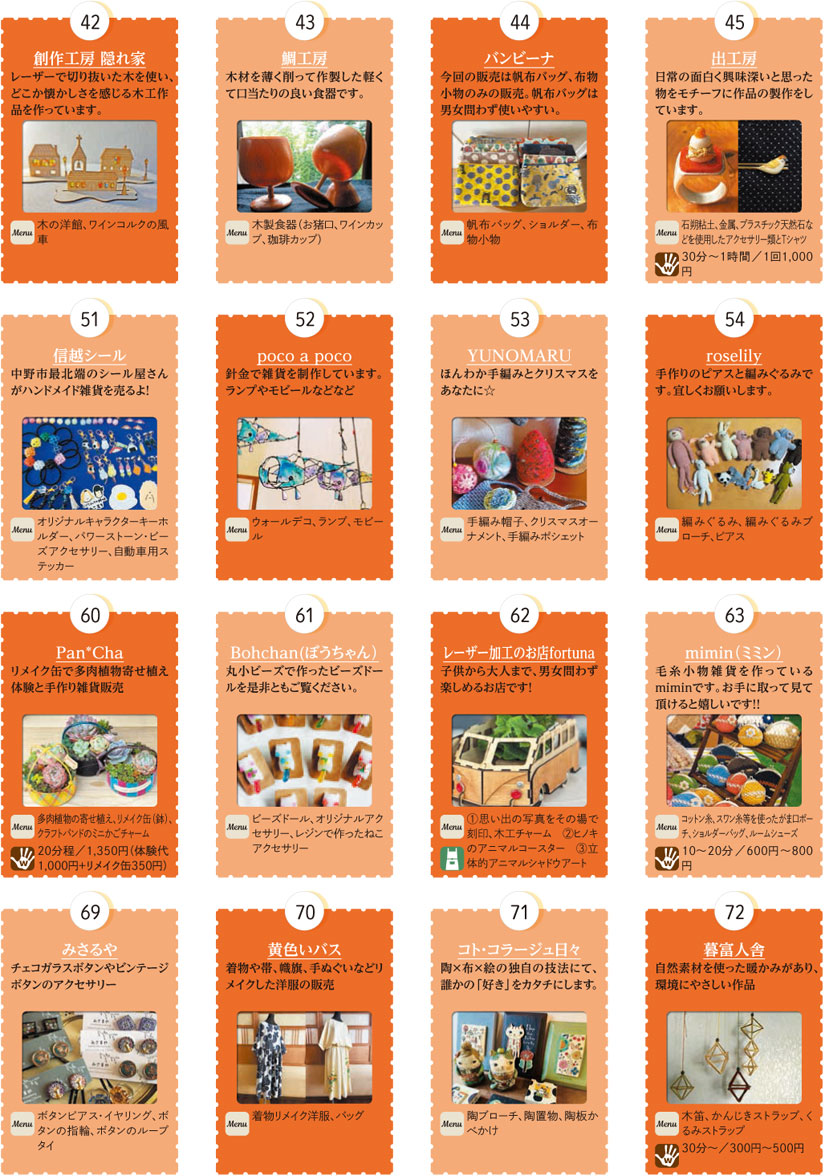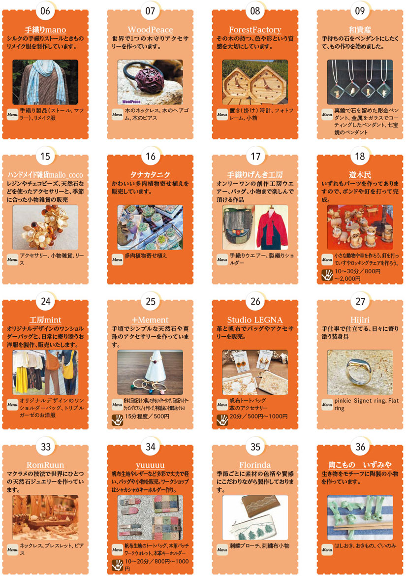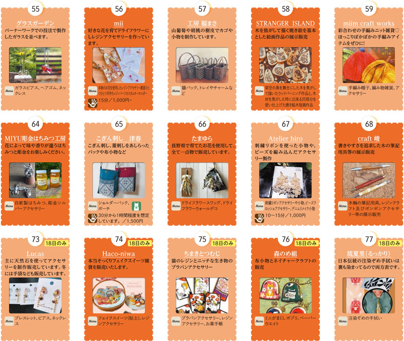WS(10〜15分/1,000円)、刺繍リボンアクセサリーや小物、デニムリメイク小物
