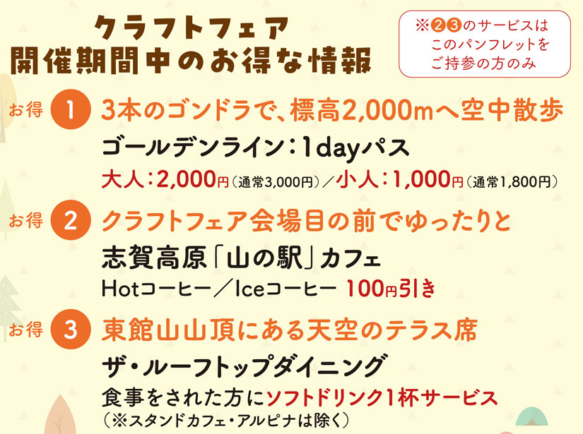 イベント開催期間中は、「山の駅リゾートセンター」を起点に東館山山頂まで続くゴンドラ「ゴールデンライン」が割引になるほか、ドリンクのサービスも。秋の志賀高原を散策するのにもぴったり。