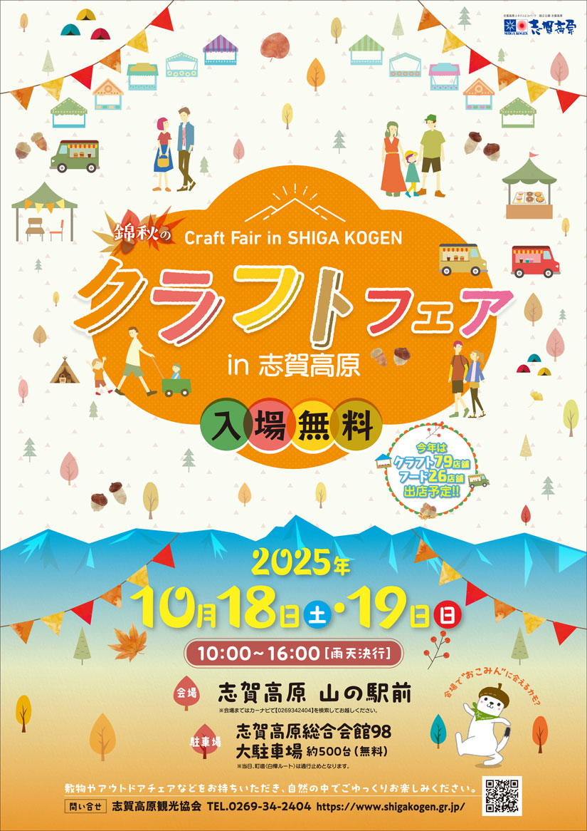 2025年10月18日(土)、10月19日(日)に長野県下高井郡山ノ内町の「志賀高原 山の駅リゾートセンター」前で『錦秋のクラフトフェアin志賀高原』が開催。屋外の芝生ひろばにクラフト出展78組とフード25店が集まり、こだわりのクラフト作品やワークショップ、イベント限定メニューも並びます。