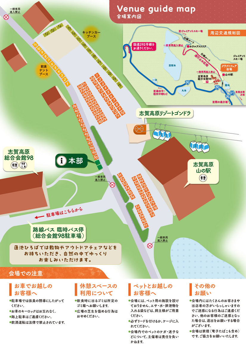 期間中、町道〈白樺ルート〉は通行止め。国道292号線を通行。会場は一般車両進入禁止エリアあり。敷物・アウトドアチェアの持ち込み可(蓮池ひろば)。