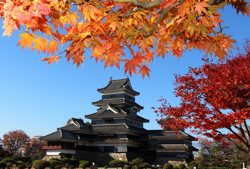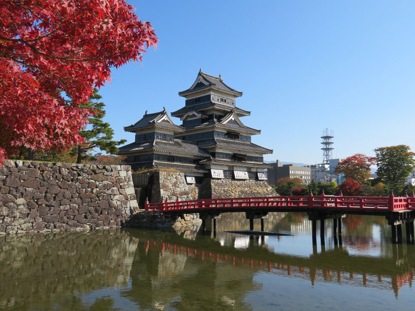 長野県松本市の「国宝松本城」は、国宝五城のひとつで、現存する五重六階の天守としては日本最古。黒漆を塗った下見板と白漆喰の外壁が織りなすコントラストに、モミジやカエデの鮮やかな紅葉が交わり秋色に染まる松本城は必見です。