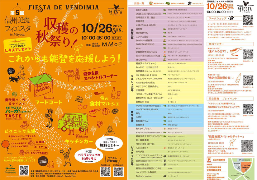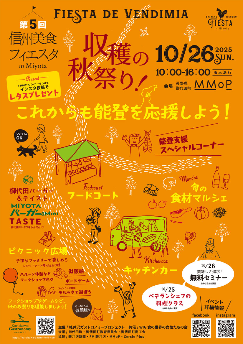 佐久ICから車で10分ほどにあるカフェ・ショップ・美術館などの複合型施設「MMoP(モップ)」で、スペイン料理研究家 渡邊万里さんが主宰を務める軽井沢ガストロノミープロジェクトのイベント『第5回 信州美食フィエスタ in Miyota』が、2025年10月26日(日)に開催。