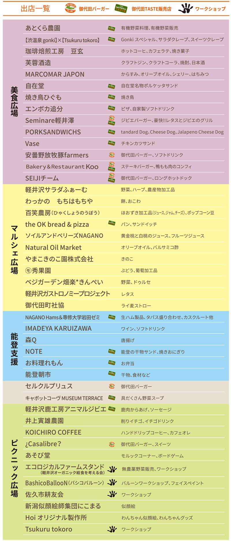 恒例となっている御代田産の新鮮レタスを使った「御代田バーガー」と「御代田TASTE」は注目したいポイント。各店のシェフオリジナルの「御代田バーガー」は、さらにバージョンアップしているそうなので、ぜひ味わってみてくださいね。※「御代田バーガー」「御代田TASTE」販売店は出店リストを参照ください