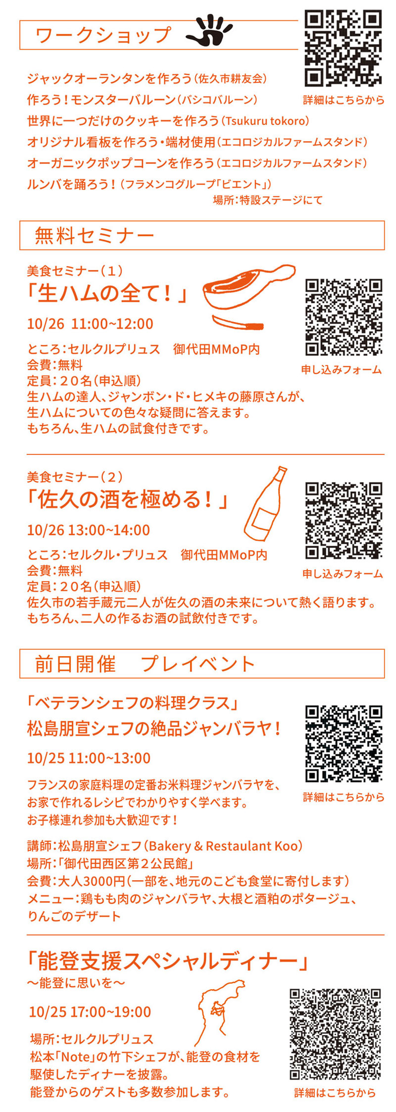普段はマルシェに出店することのないシェフたちが手がける料理も楽しめると評判の食のマルシェ。会場を美食広場・マルシェ広場・能登支援・ピクニック広場と題し、野菜やジビエ、お肉料理、スイーツ、ドリンクなど、〈収穫の秋〉をテーマに信州の美味しいものが集合します。