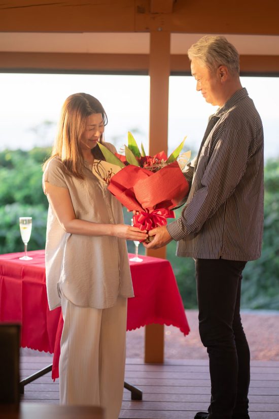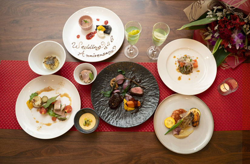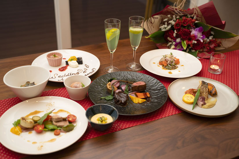 記念日やお祝いにぴったりな「アニバーサリープラン」(要予約)も用意されています。2名1組で30,000円のこのプランでは、フルコースディナーに加え、プロカメラマンによる撮影(10カット)、花束のプレゼントがセットに。海が見渡せるテラス席で、一生に残る思い出のひとときを過ごすことができます。