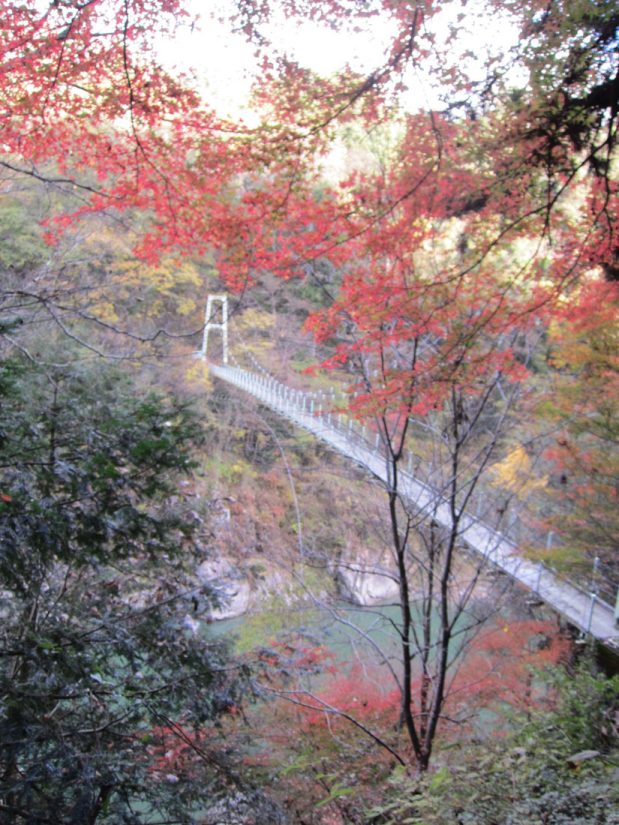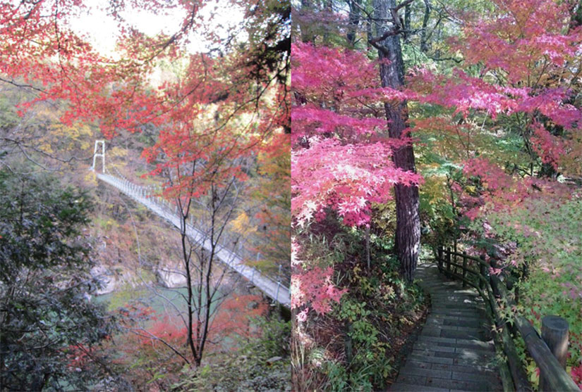 遊歩道は一周約1時間(橋2カ所)と約1.5時間(橋3カ所)の2コースが整備。短時間でも散策を楽しめるためます。また、天竜ライン下りの舟から見上げる紅葉も格別で、水面に映り込む赤や黄の木々が幻想的な雰囲気を演出します。