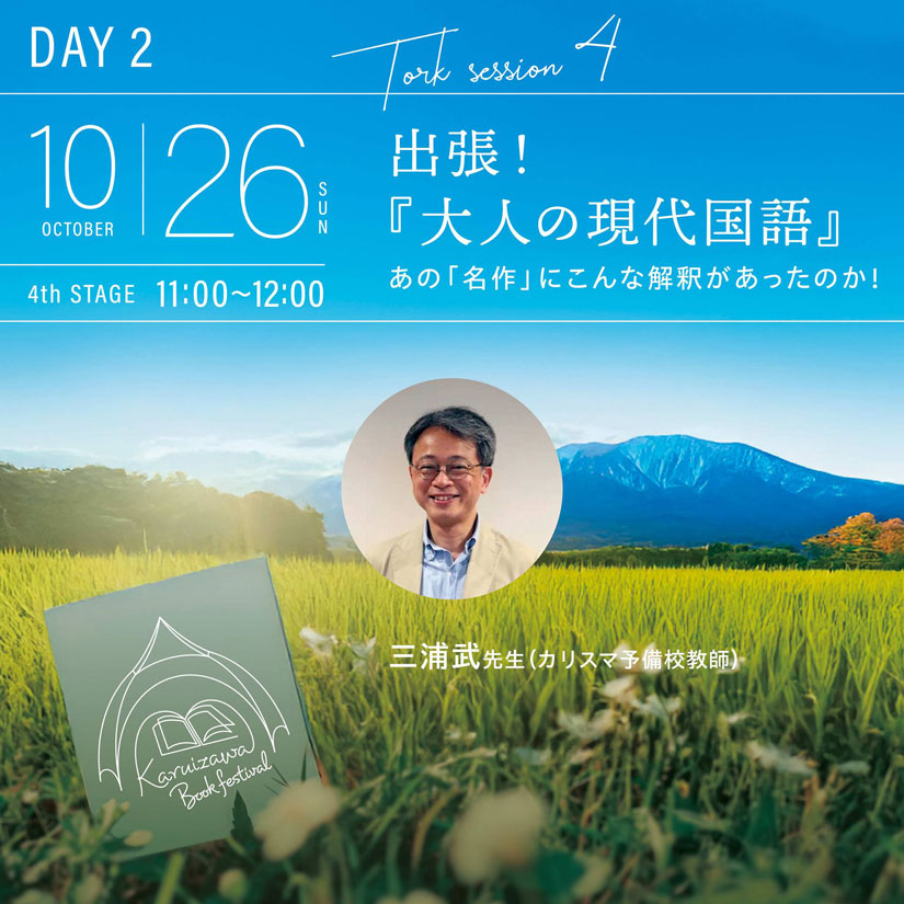 大手予備校・河合塾の現役人気講師である三浦武さんは、学生・社会人のための読書塾『大人の現代国語』を主宰。読書講座が、軽井沢に出張してくれます。誰でも一度は触れたことのある、とある「名作」を取り上げ目から鱗の新たな解釈で一緒に読み直していきますよ。