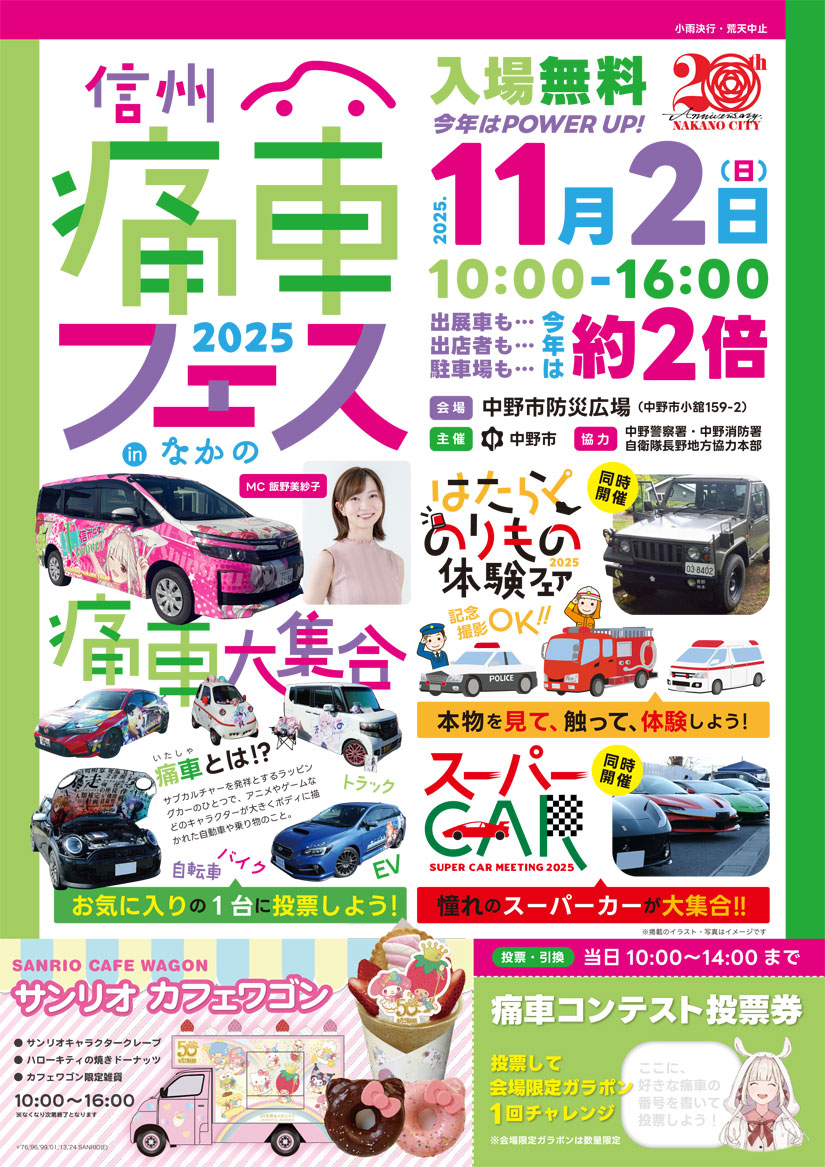 2025年11月2日(日)に長野県中野市の「中野市防災広場」で、『痛車フェス in なかの 2025』が開催。同イベントは、今年で2回目を迎えるアニメやゲームのキャラクターが描かれたラッピングカー「痛車」が大集合するカーイベント。出展車両数は前回の約2倍にパワーアップし、本物の痛車を間近に写真撮影などが楽しめるほか、コスプレイヤーも参加予定。