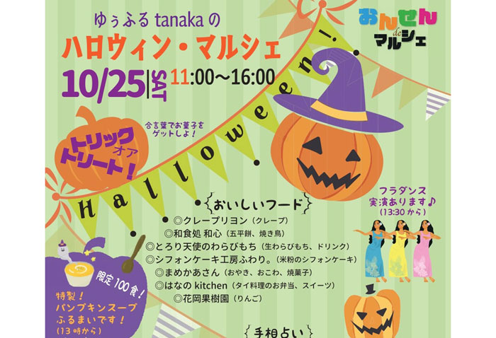 長野県東御市の田中駅前にある日帰り天然温泉施設「ゆうふるtanaka」で、『ハロウィンマルシェ』が、2025年10月25日(土)に開催。
