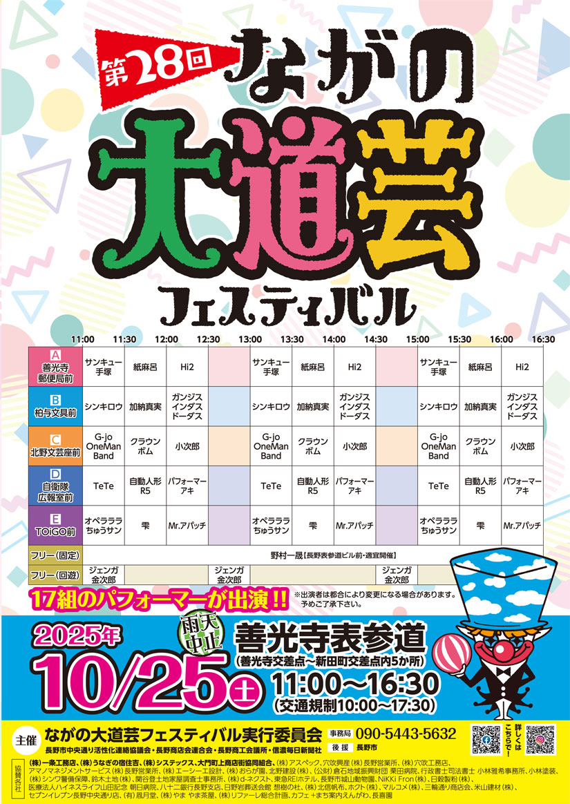 2025年10月25日(土)に長野県長野市で『第28回 ながの大道芸フェスティバル』が開催。善光寺へと続く表参道(トイーゴ前~善光寺郵便局前)が歩行者天国になり、全国で活躍する約17組のパフォーマーによる大道芸を楽しめます。ステージは、善光寺郵便局前・柏与文具前・北野文芸座前・自衛隊広報室前・トイーゴ前の5カ所。マジックやパントマイム、ジャグリング、クラウンなど、バラエティに富んだパフォーマンスを楽しんで。