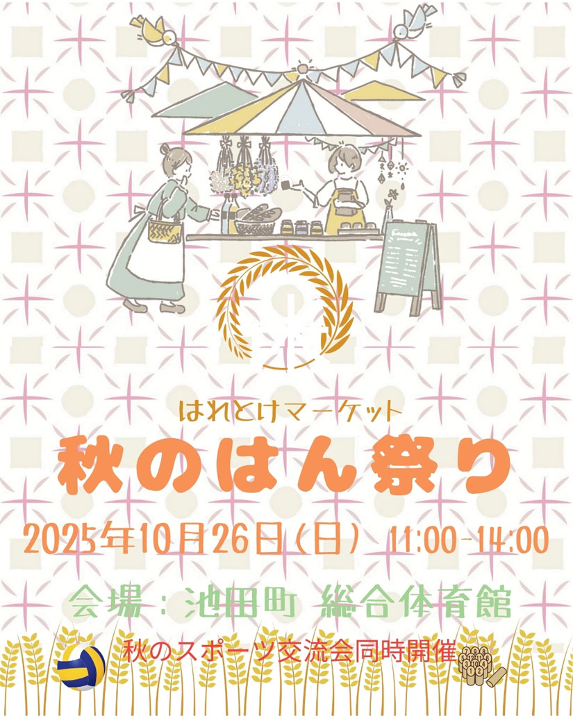 2025年10月26日(日)に長野県・池田町の「池田町総合体育館」で、マルシェイベント『はれとけマーケット 秋のはん(飯)祭り』が開催。おにぎりやおむすび、米粉フードなど、米をテーマにした多彩なお店が集結するマルシェイベント。会場には、安曇野や地域のこだわり食材を使ったおにぎり専門店や発酵食品、ベーグル、スコーンなど、バラエティ豊かなキッチンカーが並びます。また、『秋のスポーツ交流会』も同時開催。