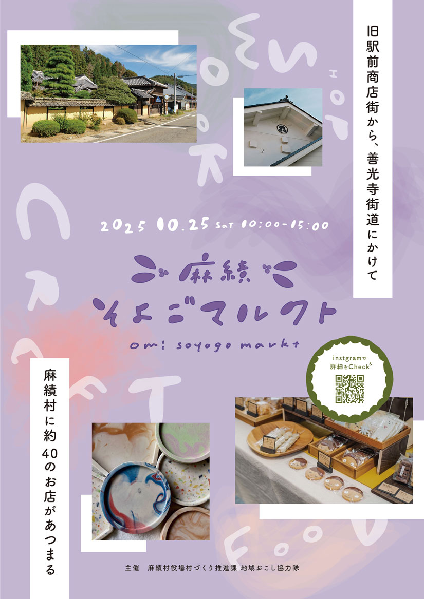 2025年10月25日(土)に、長野県東筑摩郡麻績村の麻績村旧商店街から善光寺街道沿いの「善光寺街道麻績宿」を会場に『麻績そよごマルクト』が開催。歴史あるたてものや昔ながらの建物などをまわりながら、たべもの、クラフト、ワークショップなどを楽しめるマルシェイベント。商店駐車場や旧善光寺街道麻績宿にある古民家などに約40店が集います。