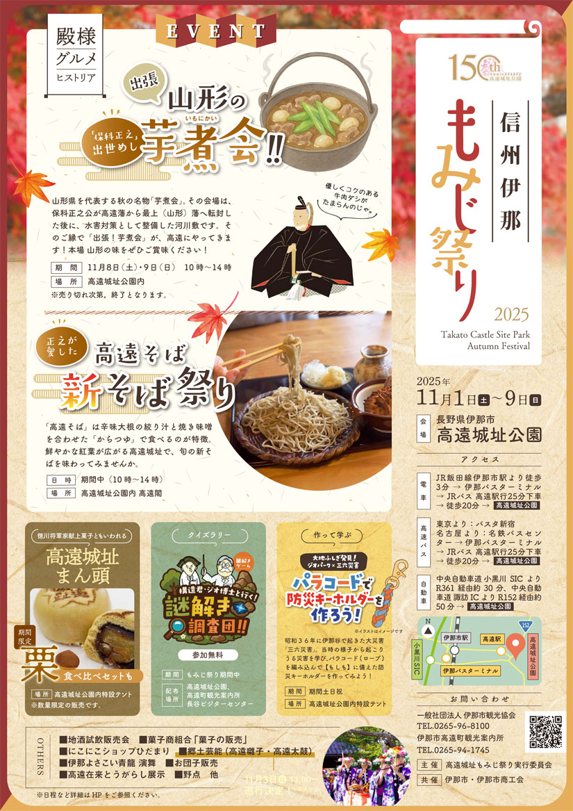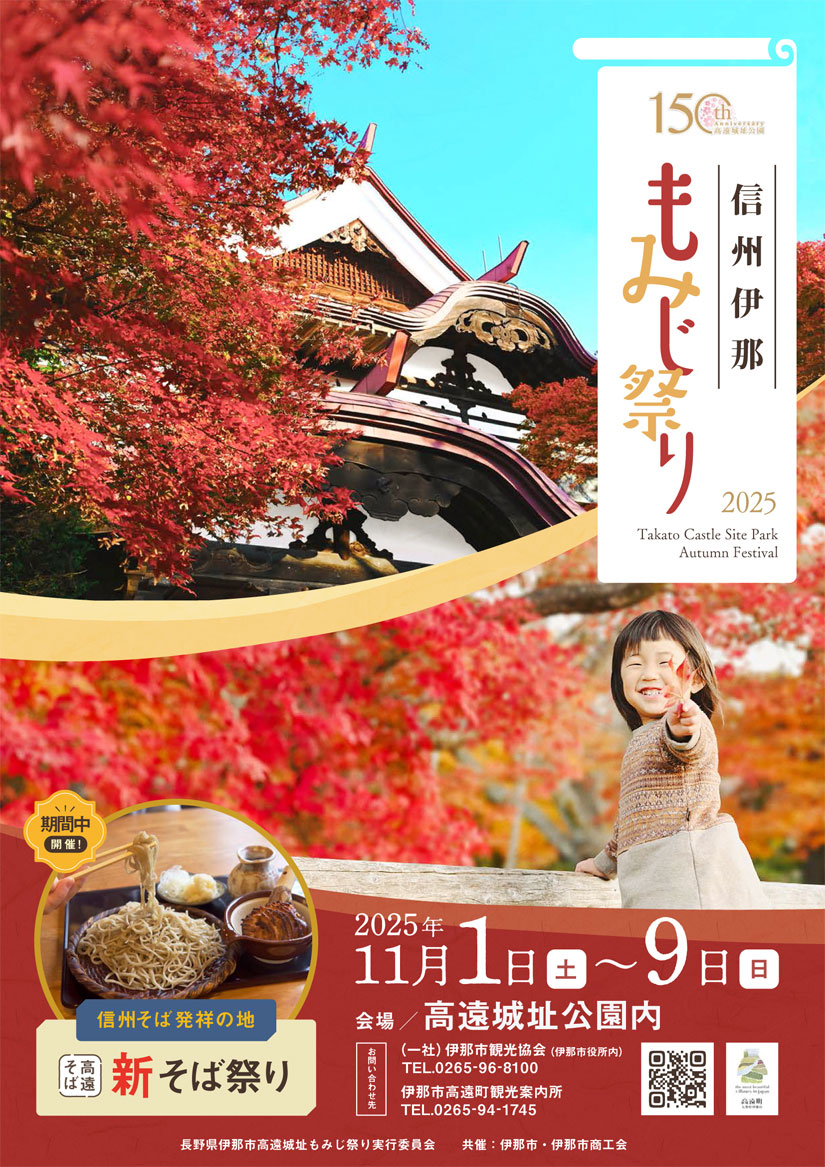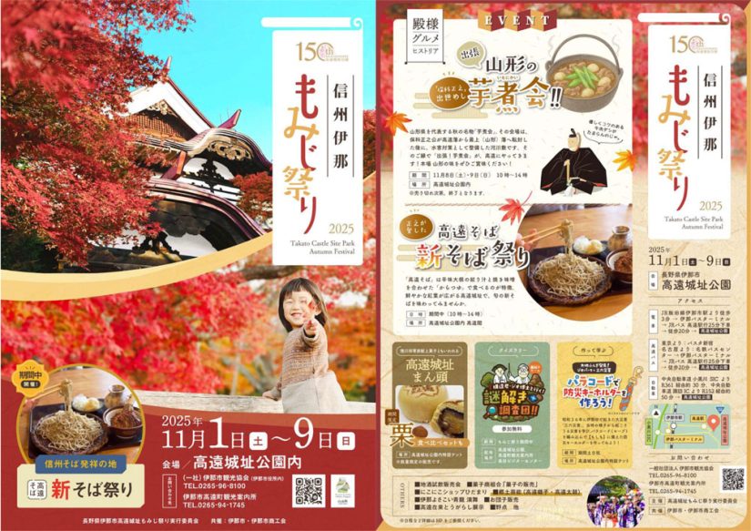 2025年11月1日(土)~11月9日(日)に長野県伊那市にある「高遠城址公園」で『信州伊那 もみじ祭り』が開催。紅葉の城跡を舞台に、「高遠そば」の新そばや初開催の「出張!山形の芋煮会」など秋の名物を楽しめる9日間の秋まつりです。ほかにもクイズラリー、作って学べる「パラコードで防災キーホルダーを作ろう!」など体験イベントも。