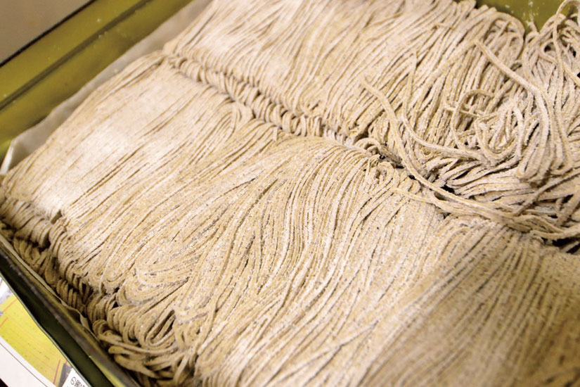 「オヤマボクチは畑を借りて自分で栽培しています。秋に収穫後、アクがなくなるまで何回も煮こぼします」。使用するオヤマボクチは蕎麦粉1キロに対して5g程度使用。ほんのわずかな量ですが、そばの質感が変化するという。そば本来の香りや自然な甘みを楽しむため、まずは卓上にある塩で食してみて。