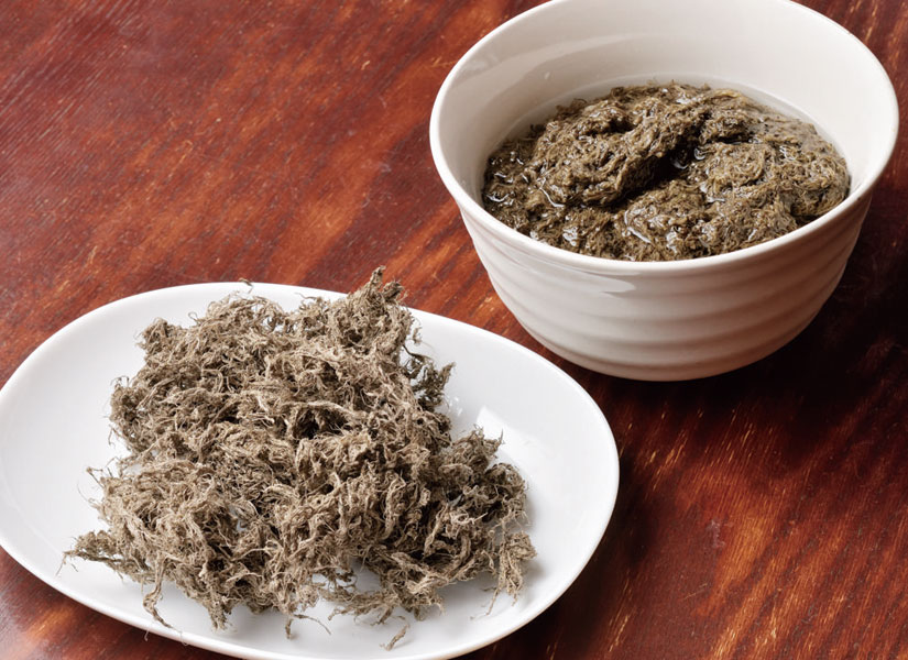 オヤマボクチの葉の繊維を取り出し、煮こぼしたもの。手前はそれを乾燥させたもので、そば60人前に対しソフトボール大くらいの大きさの量を使います。