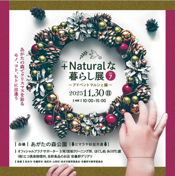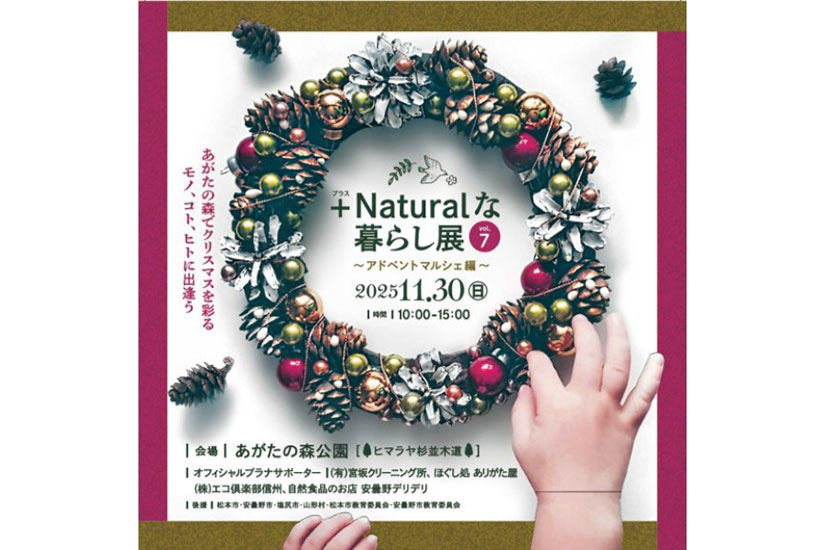 2025年11月30日(日)に長野県松本市の「あがたの森公園」で、『+Naturalな暮らし展 vol.7~アドベントマルシェ編~』が開催。”今の暮らしを少しずつ自然に寄り添ったものへ”をテーマに、からだや地球に優しいモノづくりをしているつくり手が集まる、自然派マルシェイベント。当日は、ナチュラルな素材にこだわったフード&ドリンク、クラフト作品の販売や子どもが楽しめるワークショップ、プロのカメラマンによるクリスマス撮影会、アコーディオンの生演奏などが予定されています。
