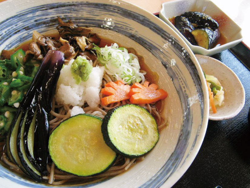 タチアカネそばに、新鮮野菜の素揚げがのった人気メニュー「こまゆみ冷やしそば」(1,200円・夏季限定)。