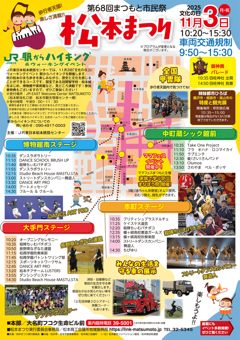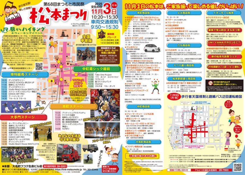 2025年11月3日(月・祝)に長野県松本市の中心市街地で『第68回まつもと市民祭 松本まつり』が開催。中心市街地が歩行者天国になり、全国甲冑隊の練り歩きや御神輿のパレード、ダンスや殺陣や吹奏楽の演奏などのパフォーマンスショー、ワゴンセール、フリーマーケット、体験イベント、姉妹都市の藤沢市・姫路市・高山市の物産展など家族で楽しめる多彩な催しが展開。