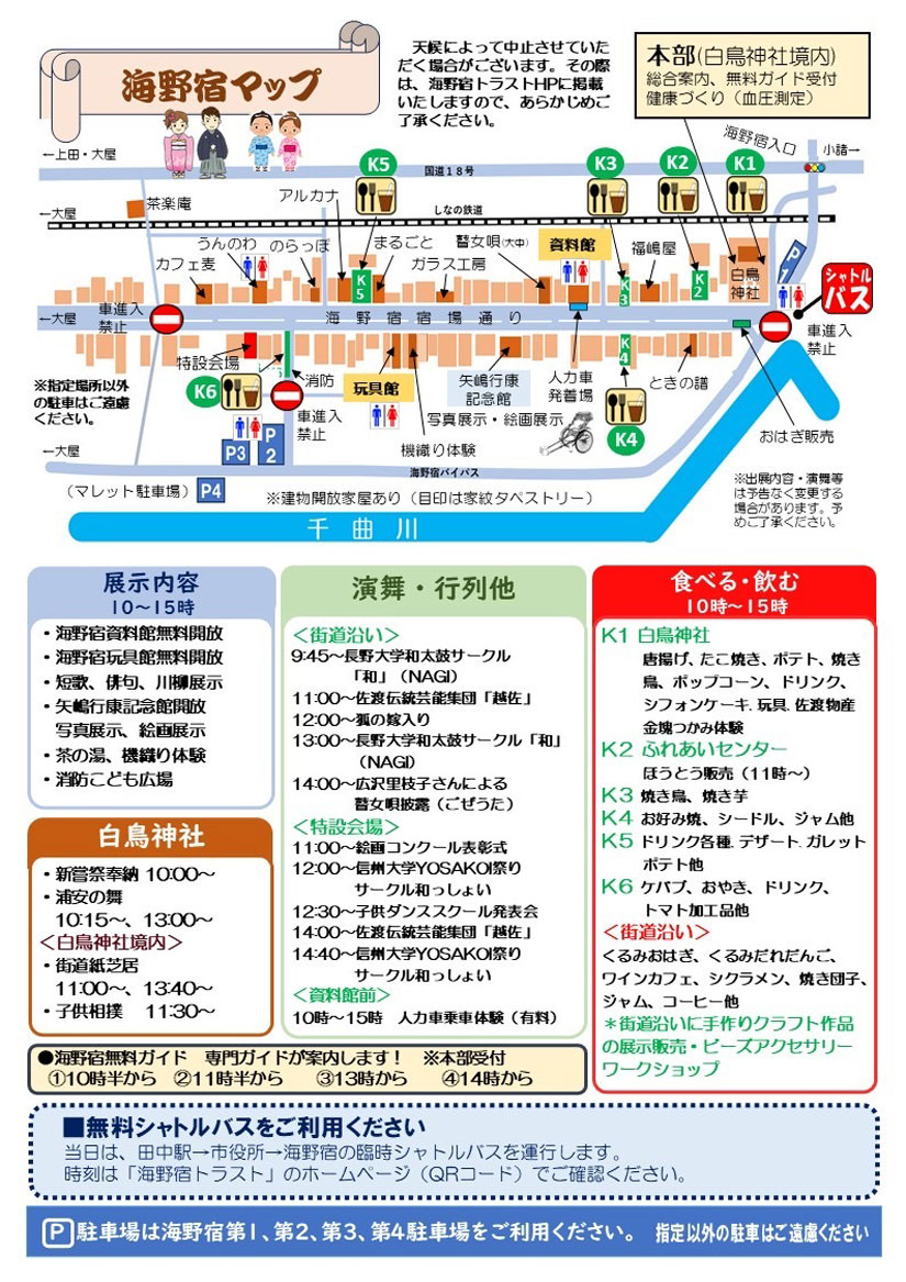●協賛 東御市教育委員会・東御市商工会・(一社)信州とうみ観光協会・海野宿商業者・田中地区地域づくりの会・田中地区安全協会・海野宿開宿400年記念事業実行委員会