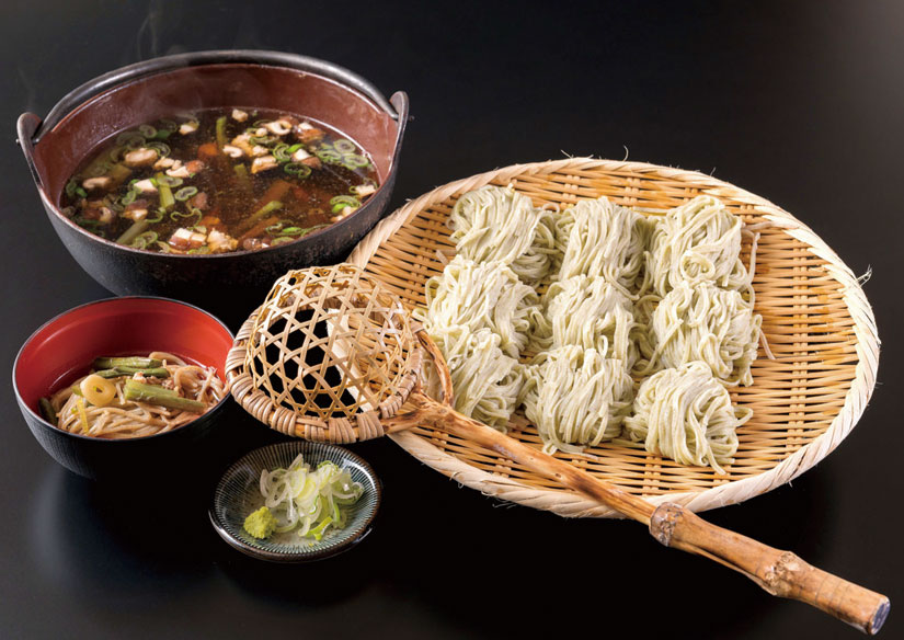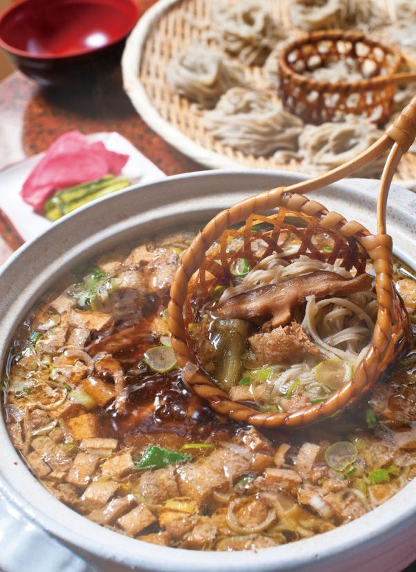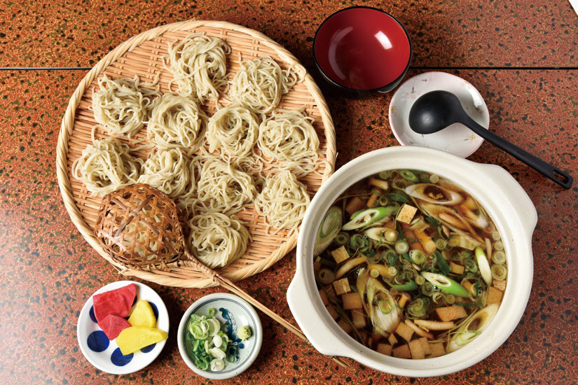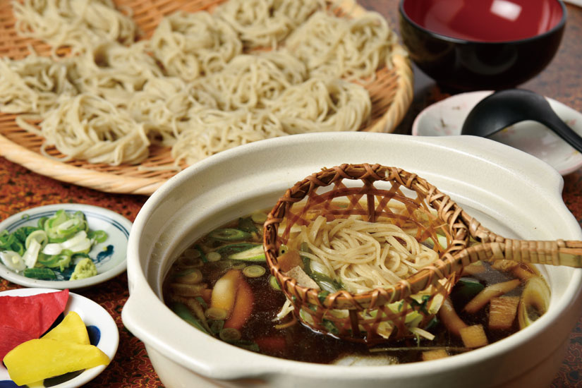 冬にそばをおいしく食べるために考案された、体も心も温まる食べ方。昔は囲炉裏を囲み、家族や近隣の人々が集まって、何度もかごを振りながら楽しく食事をしていたそう。
