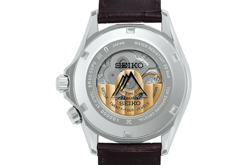 裏蓋には山脈をモチーフにしたマークがあしらわれるなど、「アルピニスト」の世界観が随所に表現されています。ムーブメントには、3日間のロングパワーリザーブを誇るメカニカルムーブメント「Cal.6R55]を搭載。