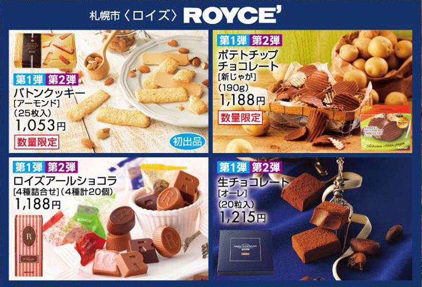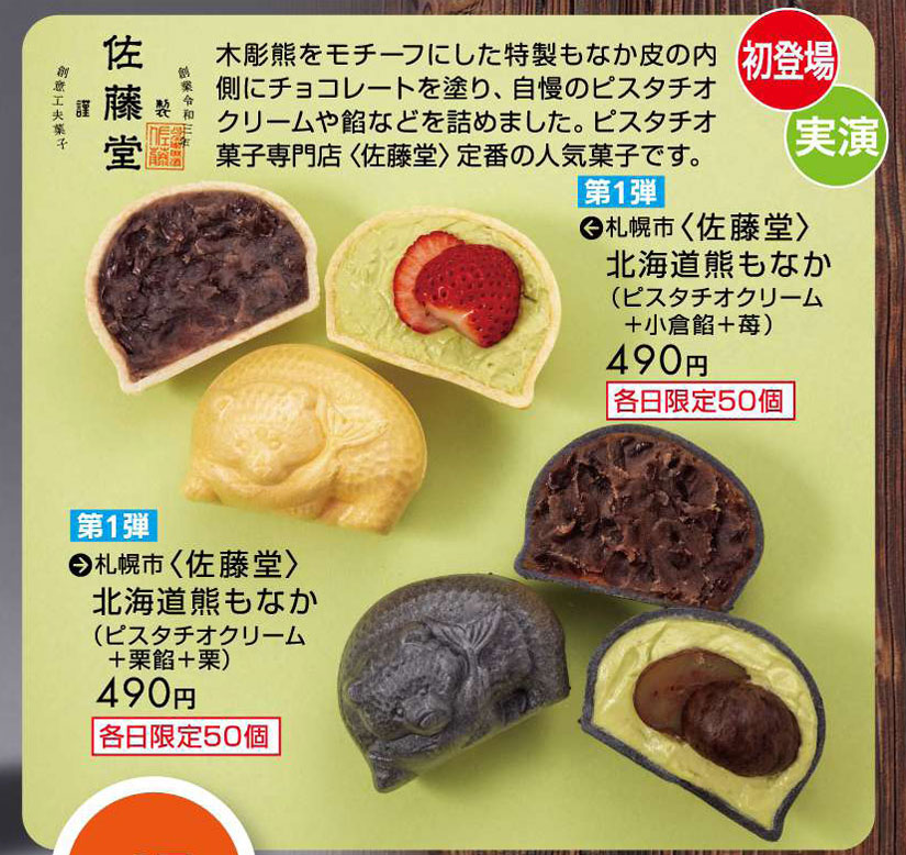 今回は札幌の新しい食文化「シメパフェ」を代表する〈パフェ佐藤〉が初出店!「南瓜と栗と葡萄のパフェ」「ピスタチオと苺パフェ」が実演販売されるほか、ピスタチオ菓子専門店〈佐藤堂〉や、世界的パティシエ・辻口博啓氏が手がける〈北海道牛乳カステラ〉をはじめ、チョコ菓子の〈ロイズ〉、「マルセイバターサンド」の〈六花亭〉など、人気スイーツが充実。