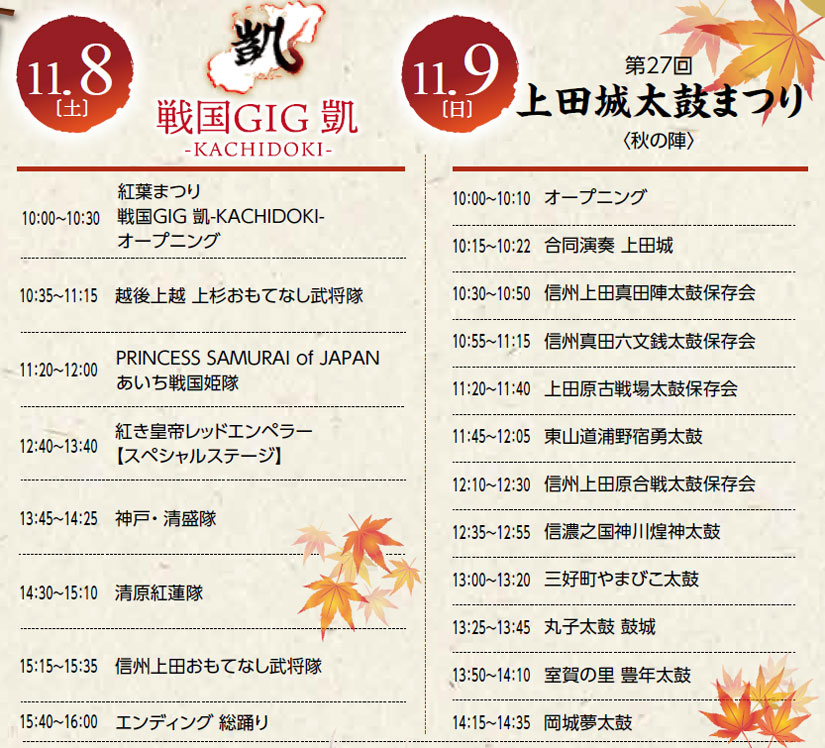 2025年11月8日(土)、11月9日(日)に長野県上田市の「上田城跡公園」のやぐら下芝生広場で、『第19回上田城紅葉まつり』が開催。紅葉に彩られた上田城を舞台に、信州上田の秋の味覚が揃う『尼ヶ淵横丁』や全国の武将隊が集結する演舞イベント『戦国GIG 凱-KACHIDOKI-』、迫力の和太鼓が響き渡る『第27回上田城太鼓まつり〈秋の陣〉』など盛りだくさんのイベントが行われます。