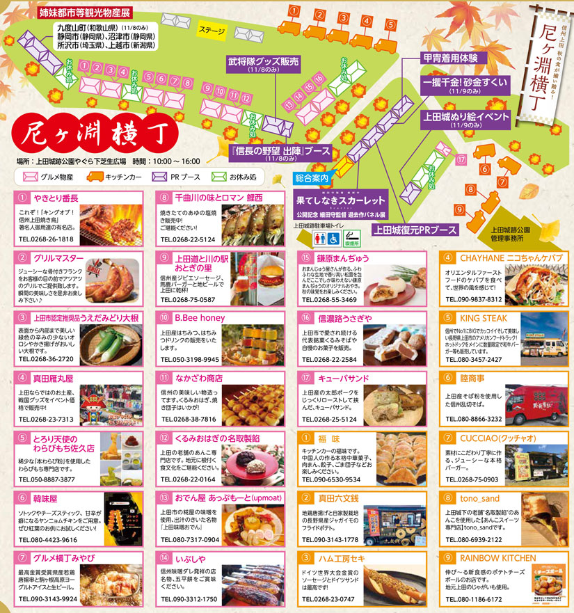両日とも10時から16時まで、「やぐら下芝生広場」に『尼ヶ淵横丁』が登場。信州上田の秋の食が揃い踏みし、地元グルメや特産品を楽しめる26店舗が出店します。