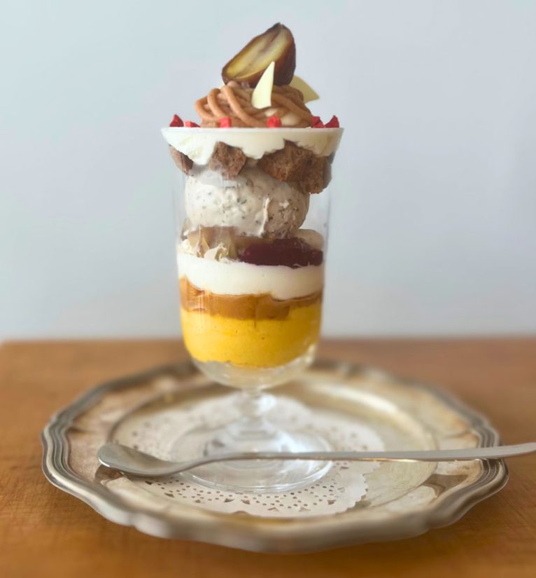 秋の訪れにあわせて提供されるのは、小布施産の栗と、八ヶ岳産の自家栽培による会津赤かぼちゃを組み合わせた秋らしいパフェ。