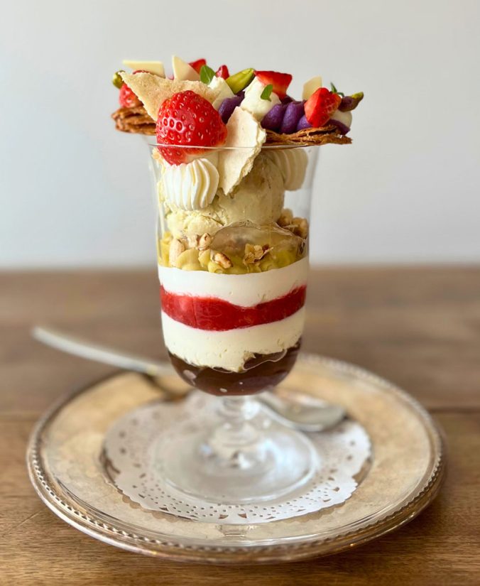 冬のご褒美にぴったりの「いちごと3種のサツマイモのクリームパフェ」は、自家栽培のムラサキ芋・シルクスイート・栗かぐやと八ヶ岳産のいちごを合わせたパフェ。ムラサキ芋の上品な色味、シルクスイートのなめらかさ、栗かぐやの濃厚な甘味と香ばしさを、いちごのさわやかな酸味がまとめる味わいは一食の価値あり。層の色彩が目にも楽しい一杯です。