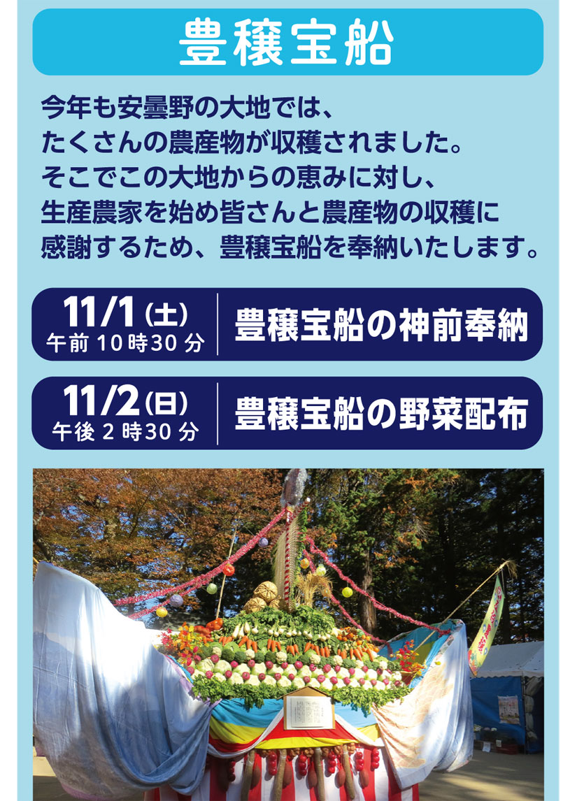 安曇野の大地で収穫されたたくさんの農産物への感謝を表すため、豊穣宝船が奉納されます。