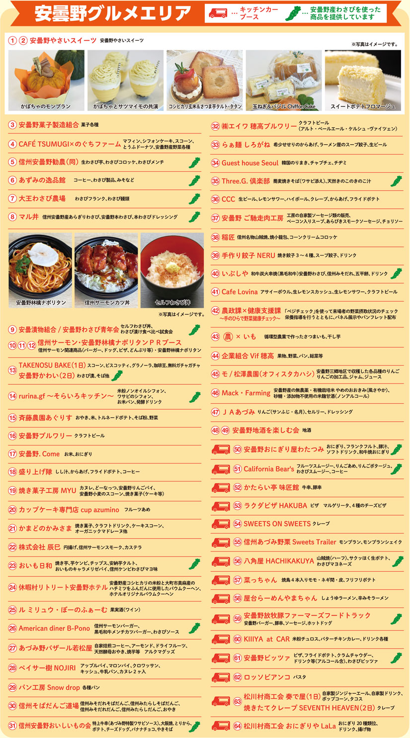 信州サーモン関連商品(バーガー、ドッグ、ピザ、丼など)、安曇野りんごナポリタン