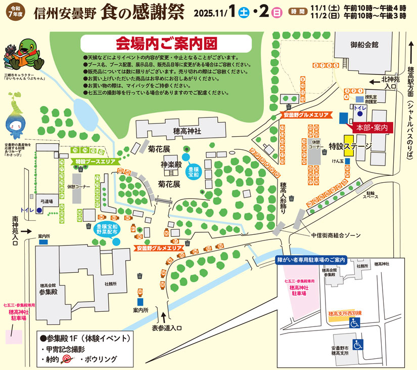 2025年11月1日(土)・2日(日)に長野県安曇野市の「穂高神社」で、『信州安曇野 食の感謝祭』が開催。自然豊かな安曇野の「食」の魅力を発信し、地域の食材や食文化を楽しむイベント。会場には84のキッチンカーやブースが出店し、安曇野産わさびをはじめとする地元の農産物を使った多彩なグルメが集結。セルフわさび丼やわさびコロッケ、信州サーモンを使った料理など、安曇野ならではのメニューが味わえます。また、ステージイベントや体験コーナーも充実。2日目には豊穣宝船の野菜配布も行われますよ。
