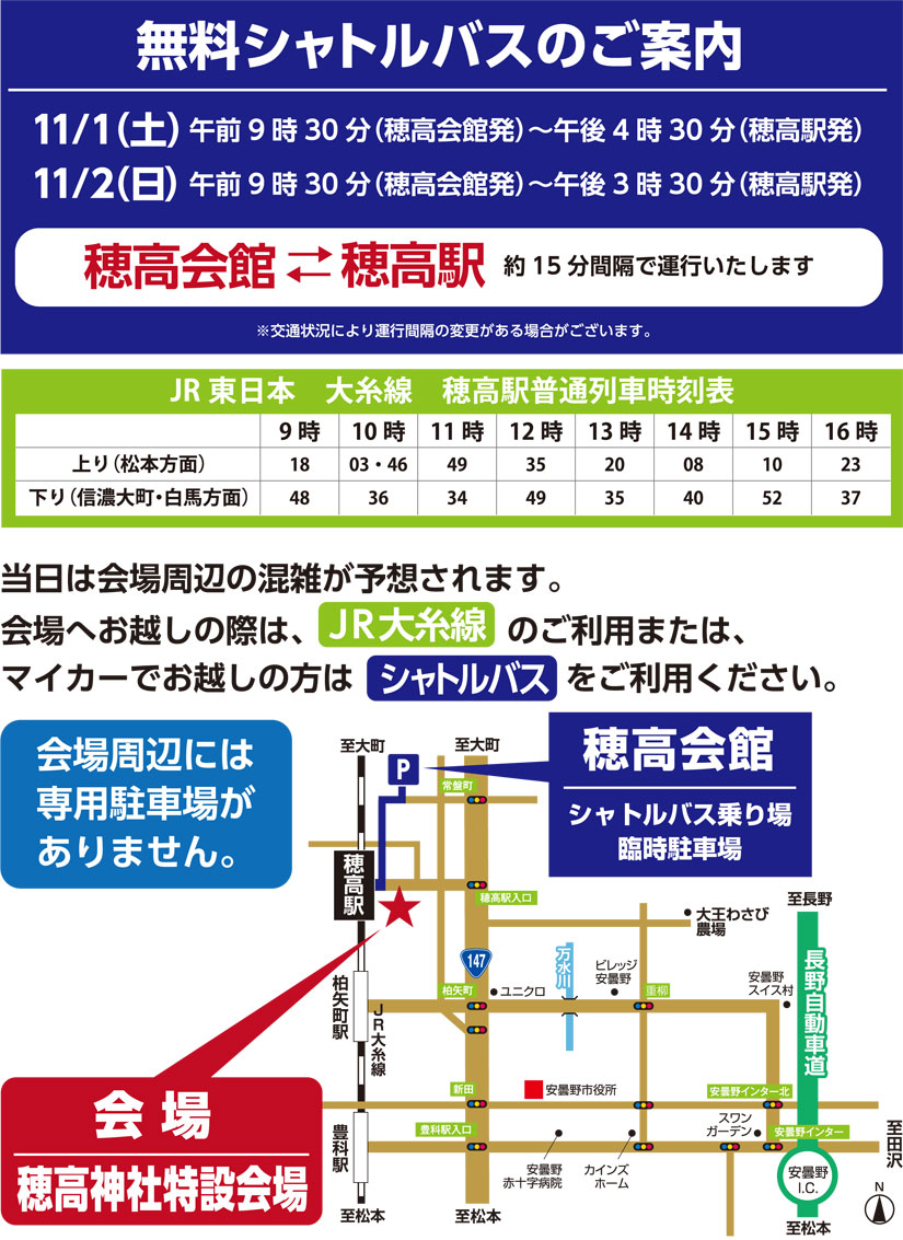 会場周辺には専用駐車場がありません。臨時駐車場があるJR東日本大糸線穂高駅からは、無料シャトルバスが約15分間隔で運行されます。