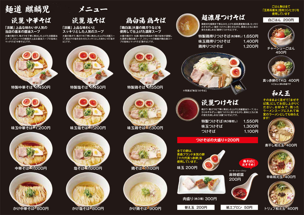 ◆「麺道 麒麟児 松本空港東店」メニュー表