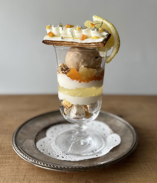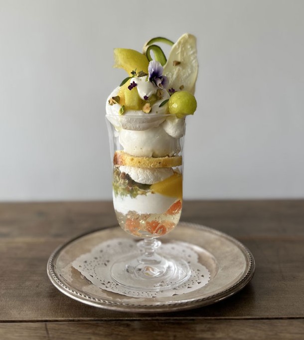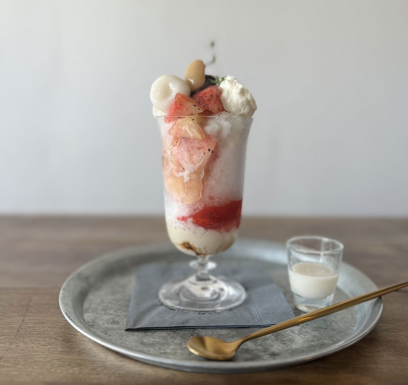 季節に合わせて旬のフルーツや野菜を使った「季節のフルーツパフェ」やかき氷などのスイーツを提供。旬の素材を活かした多彩なラインナップがそろいます。写真は「柑橘とフレッシュチーズのパフェ」