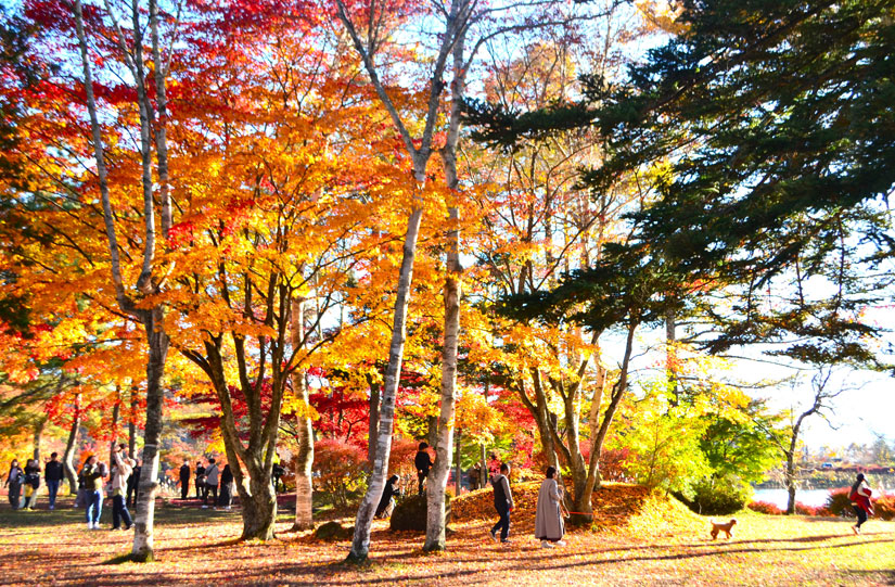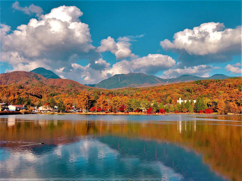 長野県茅野市にある標高1,250mのビーナスライン沿いにたたずむ高原の湖「蓼科湖」。蓼科山や横岳の山容が湖面に映し出されるほど静かな湖です。周囲をモミジ、カラマツやシラカバの林が囲い、秋には紅葉が湖を色鮮やかに染め上げます。