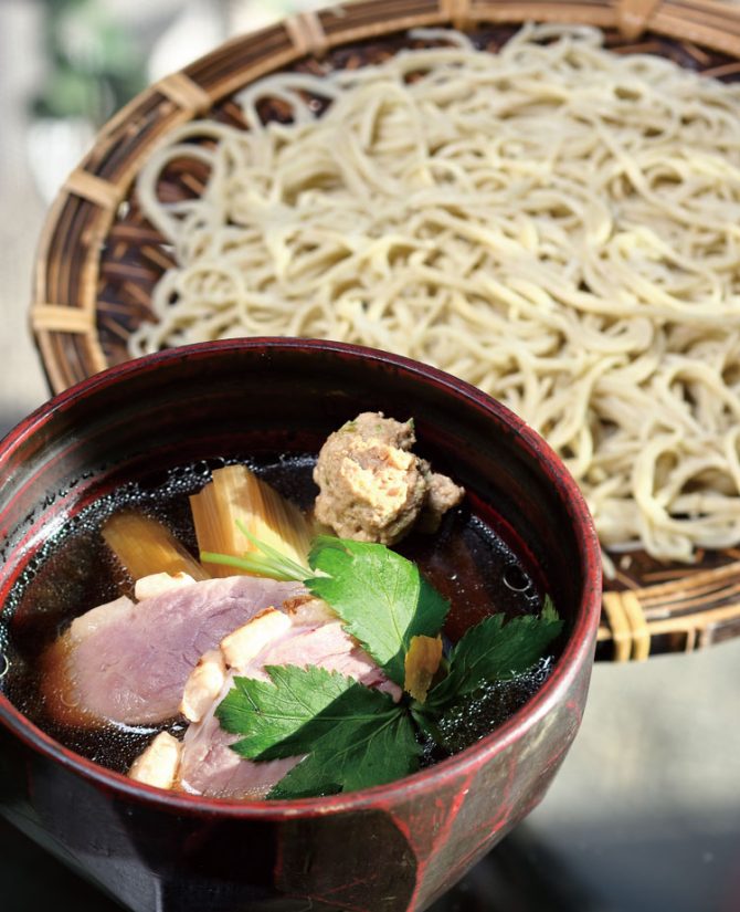 蕎麦粉とつなぎの小麦粉の割合が10対2の「外二そば」を使用。「合鴨せいろ」のつけ汁には鴨肉のスライスが入り、満足感が高いと評判の一品。