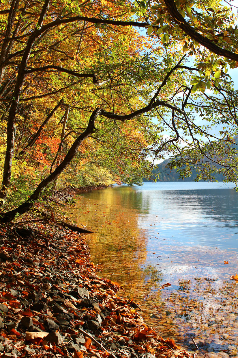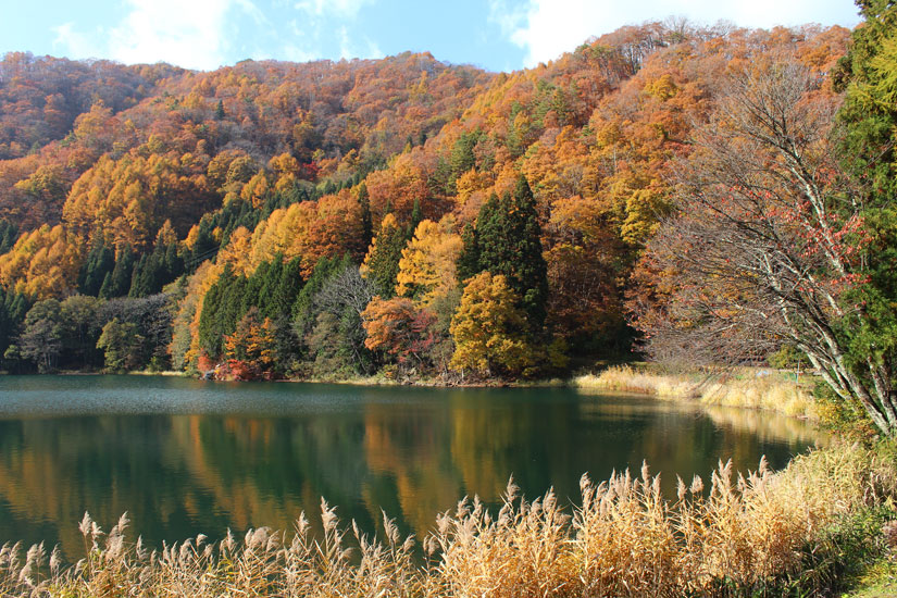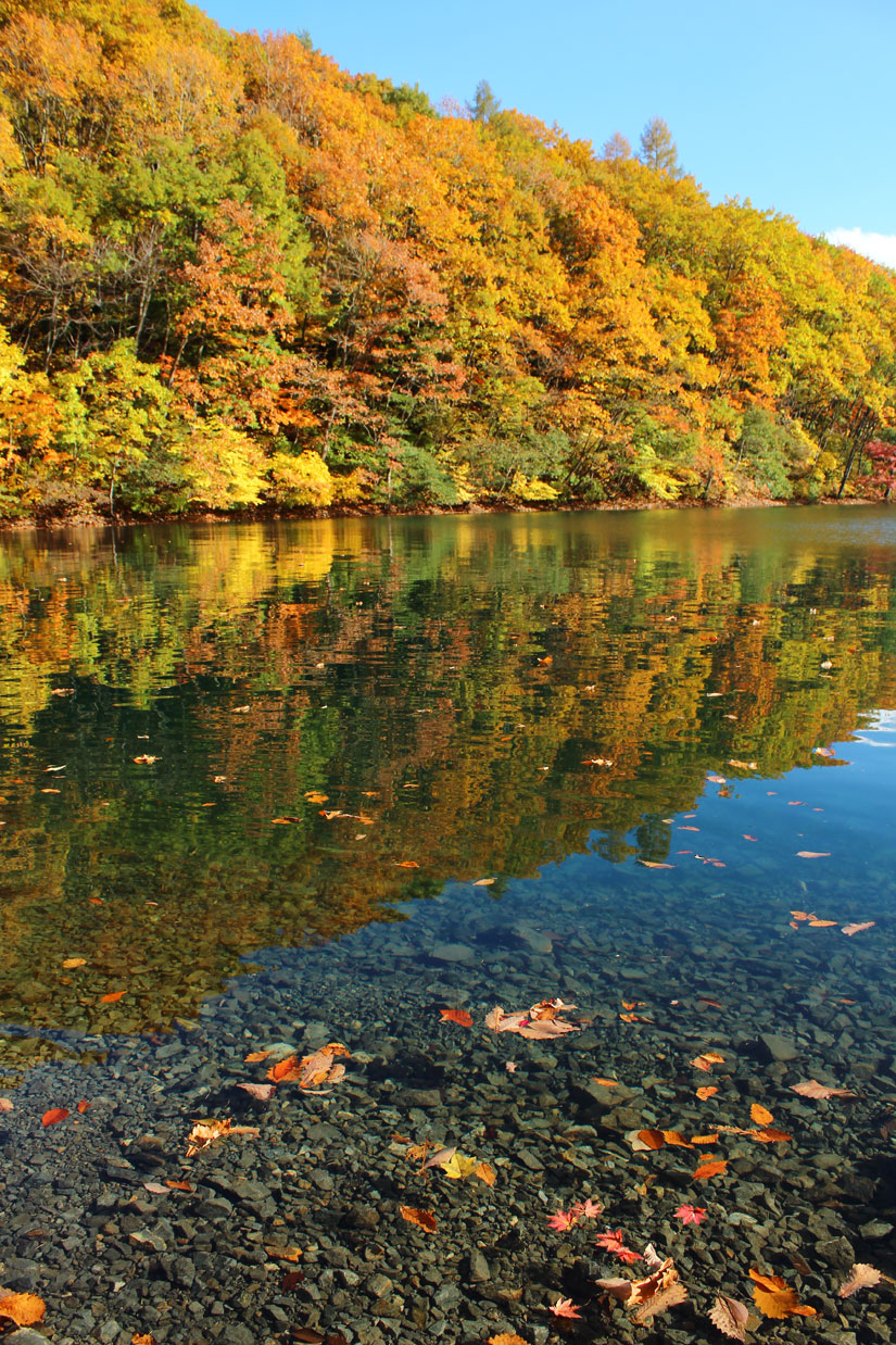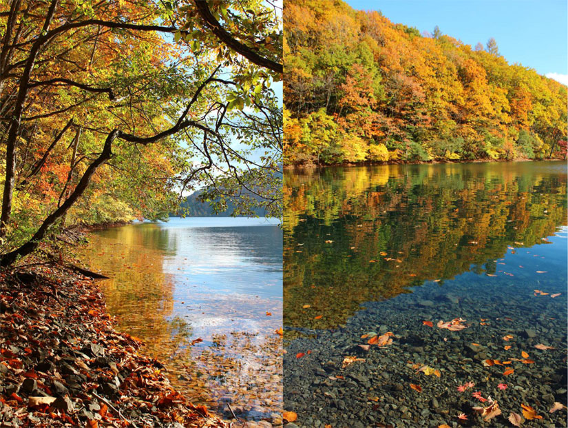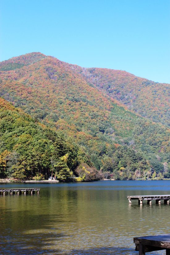 「中綱湖」仁科三湖の中では最も小さい湖。湖面に映る紅葉は圧巻。桜の時期には桜スポットとしても人気。