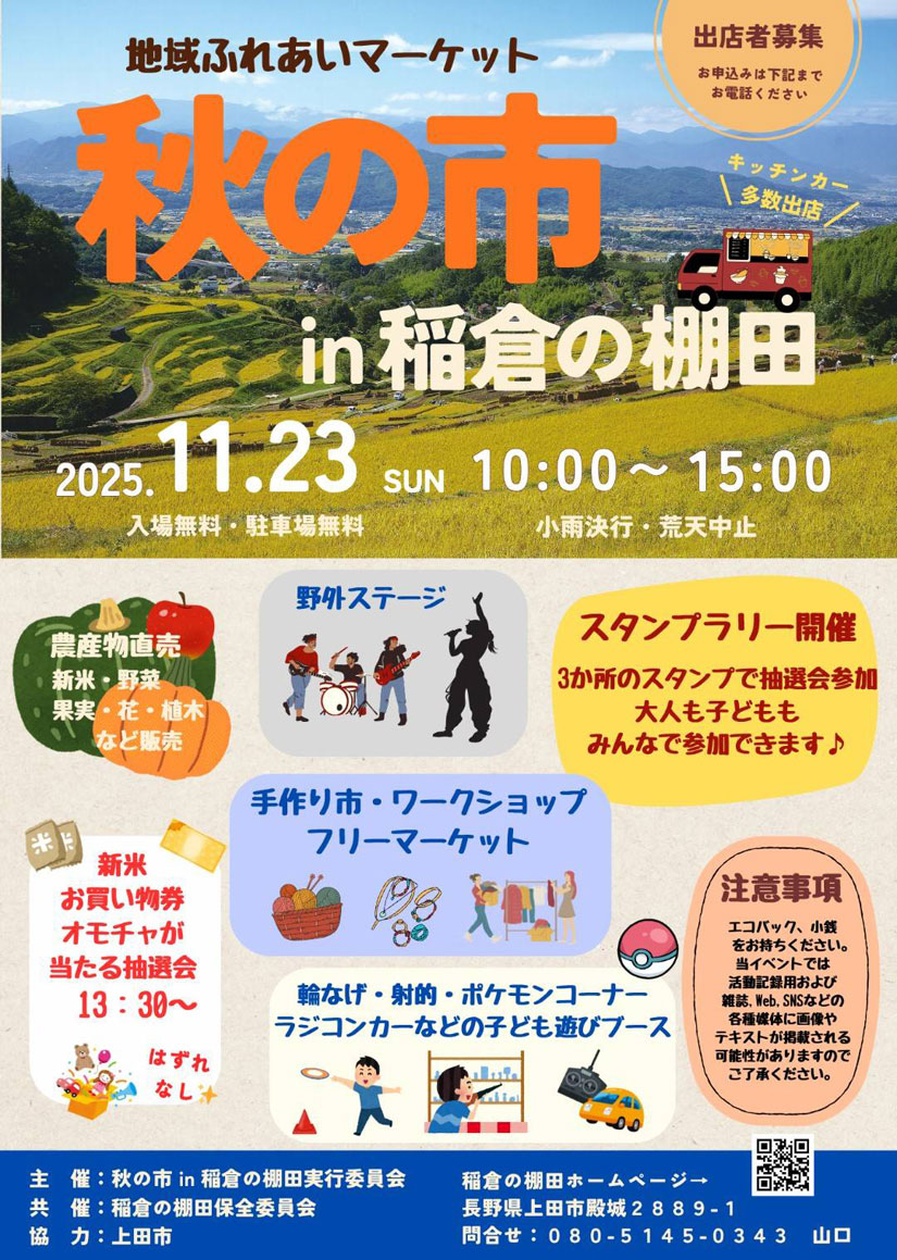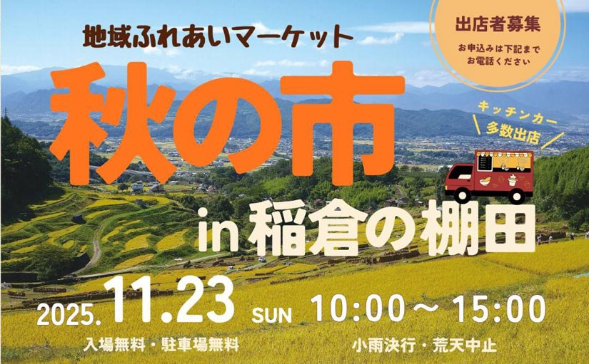2025年11月23日(日)に長野県上田市にある、「日本の棚田百選」にも選ばれた名所「稲倉の棚田」で『秋の市 in 稲倉の棚田』が開催。黄金色に染まる棚田を背景に、地元シンガーによる野外ステージのライブやフリーマーケット、農産物の直売、手づくり市、ワークショップなど多彩な催しが楽しめます。