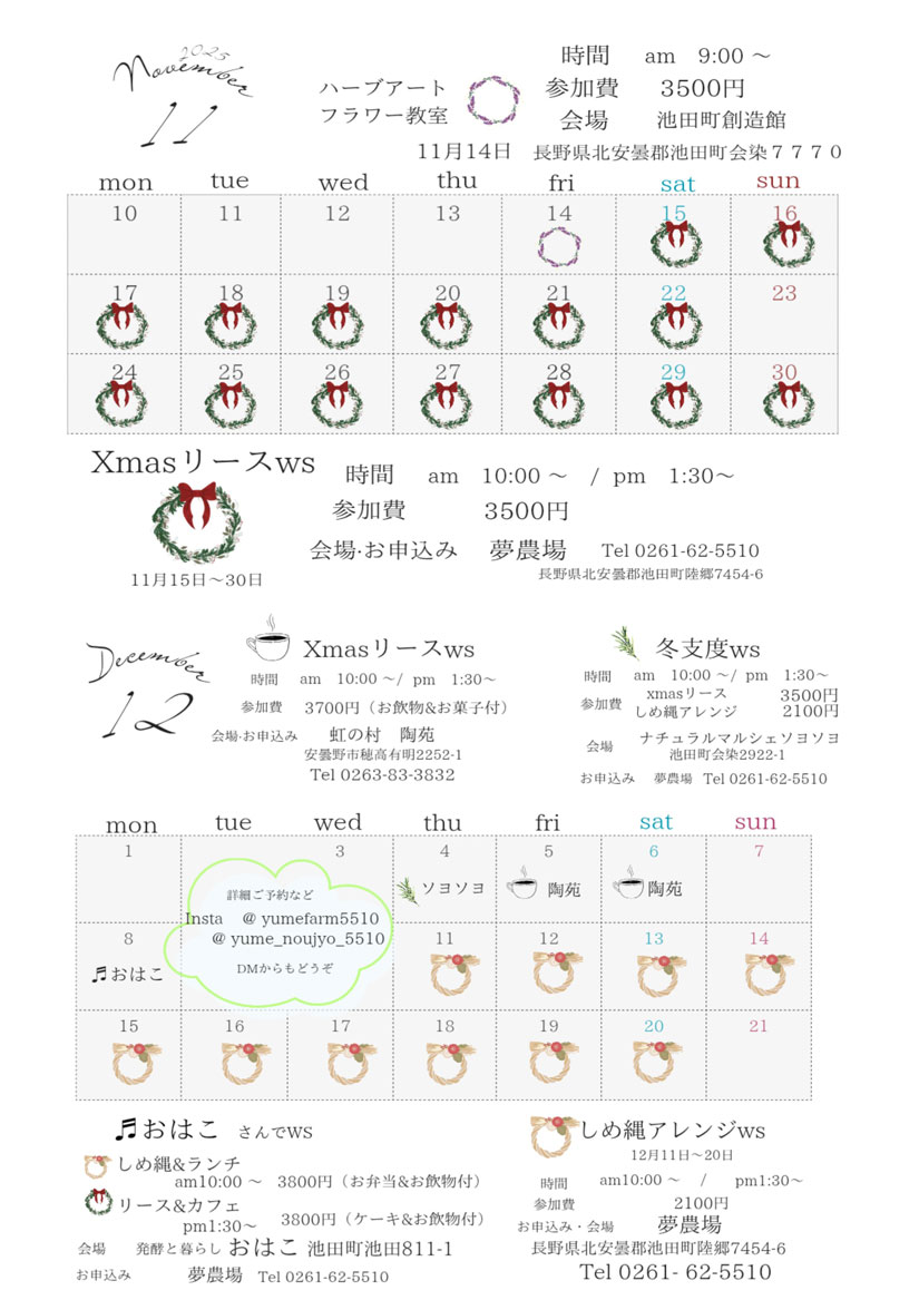 11月は、ツルの土台を作るところから始まり、自然素材の中から好みのものを選んで飾り付けできるオリジナルクリスマスリースづくりのワークショップ。12月はドライフラワーをお好みで選べ、アレンジができるしめ縄飾りのワークショップがあります。そのほか、会場を移してランチやカフェ付きで行われる同ワークショップの出張版も開催予定。