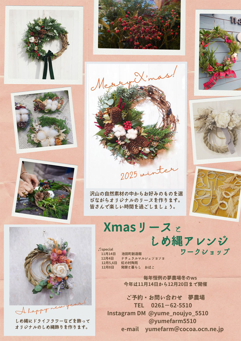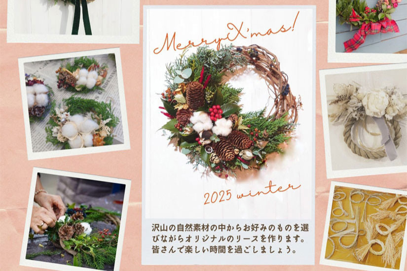 長野県・池田町にある「夢農場」「池田町創造館」ほか3会場で、『2025年冬 Xmasリース&しめ縄アレンジワークショップ』が2025年11月15日(土)~12月20日(金)に開催。クリスマスと新年に向けて、たくさんの自然素材の中から自分好みのものを選んで、オリジナルのリースやしめ飾りを作るワークショップです。