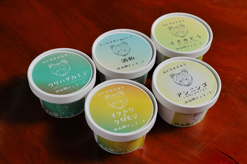 「秋山郷ジェラート」は、同館内で種類ごとに丁寧に手作りする逸品。「ふきのとう」、「酒粕」のほか、「ウリハダカエデ」、「クロモジ」、「イタドリ」など、地域で昔からお茶やおやつとして食されてきた植物を使用しており、新鮮な牛乳との相性も抜群です。各350円。